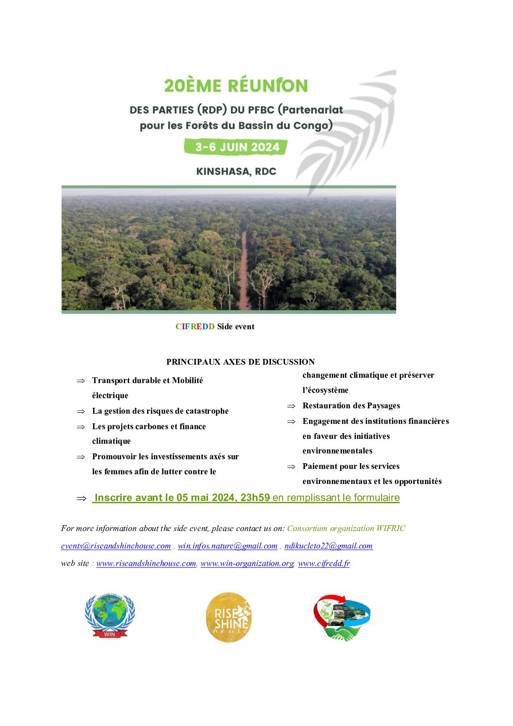 En marge de la 20ème réunion des Parties du Partenariat pour les Forêts du Bassin du Congo (PFBC), un événement parallèle « SIDE EVENT », a été organisé par un consortium d’organisations de droit burundais, regroupées sous le sigle WIFRIC (WIN, FONDATION-LAB, Rise and Shine House ET CIFFRED), en collaboration avec l’Ambassade du Burundi en République Démocratique du Congo (RDC). Cet événement, placé sous le patronage de Son Excellence Monsieur l’Ambassadeur Agricole Mwamba Ntirampeba, Ambassadeur Extraordinaire et Plénipotentiaire du Burundi en République Démocratique du Congo (RDC), a été organisé sous le thème : « Initiatives novatrices sur les finances climatiques et le développement durable au Burundi ».